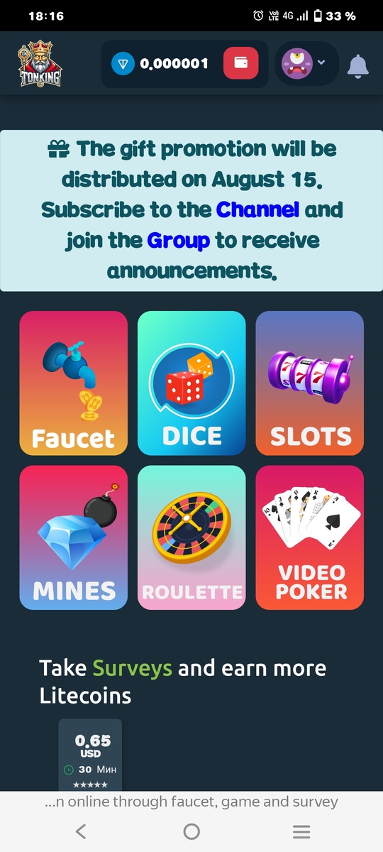 Сегодня первый день начал играть,по началу подумал что полный разводняк как это обычно бывает но нет.Реально можно поднять немного TON. Миллионы конечно же не заработать точнее не наиграть,ну на мороженку хватит,я играю в кости и придумал свою стратегию по выграшам,так же может каждый Если тебя заинтересовало переходи по ссылки Регистрируйся и начинай играть. Выигрыш можно вывести на свой крипто кошелек.