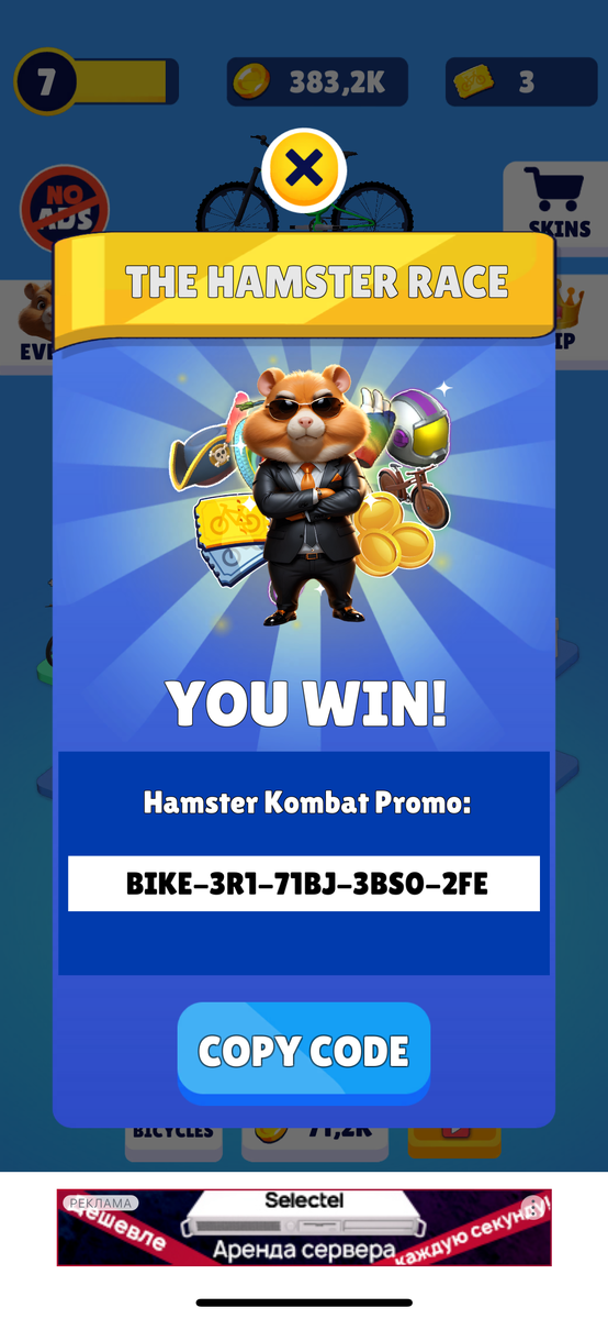 Недавно в игре Hamster Kombat недавно появились мини-игры, которые озаряют добыть ключи. Однако, после этого появилась сторонняя игра Bike Ride 3D, где катаясь на велосипедах можно зарабатывать коды на ключи в игре Хомяк. Всего можно получить 4 кода в день, соотвественно 4 ключа в Hamster Kombat. После получения кода его нужно скопировать и вставить в игре во вкладке Playground. Многие игроки столкнулись с проблемой, что им код не выпадает, для этого следует выполнить следующие действия и все заработает: А пока ждем дроп от Хомяка заходим в перспективный проект от российского предпринимателя, который обещает жирный дроп. Проект называется City Holder. Игра находится на стадии beta-тестирования, то есть сейчас некоторое количество игроков, в число которых вхожу и я, тестируем игру и помогаем разработчикам исправить баги. Игра, скажу вам сразу покруче Хомяка в виде геймплея, а также разнообразнее по прокачке. Таким образом сразу стоит отметить, что и ожидания от нее будут приятнее. Ссыл