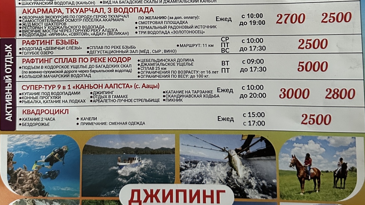 Начну с того, что мы не знали куда поехать. Набрали рекламки с экскурсиями и сели изучать. На Рицу ездили, в Новом Афоне были…хммм что же такого выбрать, чтобы и эмоции и активности и что-то новое. Увидели Супер-тур 9в1 «Каньон Аапста» и сразу зацепились за идею попробовать все и сразу. Многое из предложенного в программе для нас в новинку. Так и решили. Забронировали места на нужный день и внесли предоплату. Стоимость для детей от 7 до 12 лет - 2800₽, для взрослых - 3000₽. ДЕНЬ ЭКСКУРСИИ. Как все было: В 9:30 нам позвонил гид и сказал выходить. Мы двигались в сторону выезда из города и собирали других участков экскурсии. Что нужно взять с собой: Дорога до первой остановки заняла около часа. Мы любовались видами и не плохо протряслись 😅 ДЖИПИНГ (Уазинг) Мы прибыли на первую активность. Разбились по группам и сели в свой новый транспорт. Таким необычным способом нас доставили к базе, где будет проходить весь оставшийся день. В 12:30 мы прослушали куда нужно идти, что дела