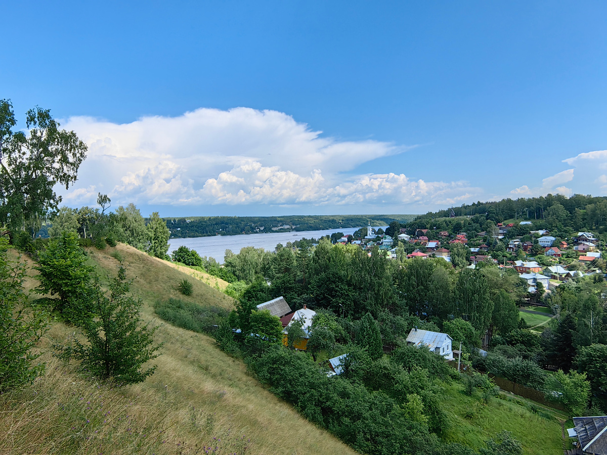 Действительно, красиво - берёзы, у склона домишки, ни одной хибары (в любом другом месте нашлось бы кладбище нескольких сараев), вдали серебрится Волга. На горе напротив - ее называют горой Левитана - деревянная церковь. Туда мы попозже тоже поднимемся.