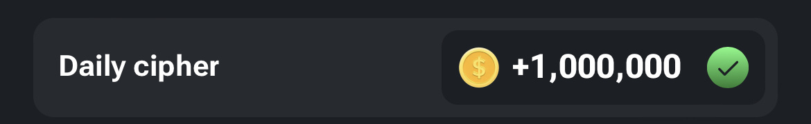 Секретная комбинация на 31.07 ❓ Как вводить секретную комбинацию: 1.Необходимо нажать на иконку "Ежедневный шифр" 2.Затем на монетке хомяка отбиваем шифр по азбуке Морзе: ⚫️ [точка] - короткий тап по кнопке ➖ [тире] - длинный тап с залипанием После выполнения задания Вы получите бонус 1 млн. V • • • — A • — U • • — L • — • • T — ПОДПИСЫВАЙСЯ НА МОЙ КАНАЛ , ЧТОБЫ НЕ ПРОПУСТИТЬ ОБНОВЛЕНИЯ HAMSTER COMBAT 🐹
