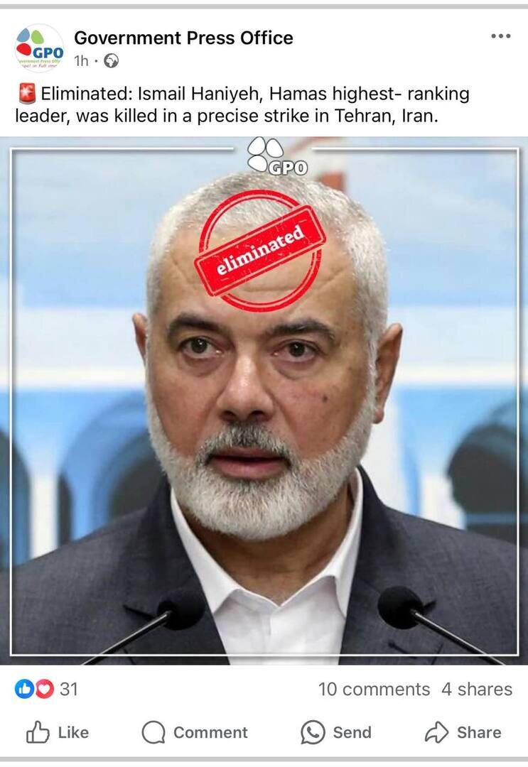 И даже после того, как Нетаньяху запретил своим министрам комментировать убийство Хании израильское правительство намекнуло на свою ответственность за убийство главы Политического бюро движения ХАМАС Исмаила Хании через Facebook на своей странице посредством опубликованной фотографии Хании с красной печатью на лбу и с написанными на ней словами "устранен, ликвидирован". Фотография была подписана - "Исмаил Хания, Верховный лидер ХАМАСА, был убит в результате точного удара в Тегеране, Иран".