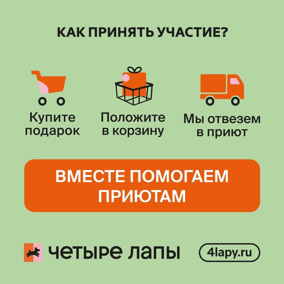 Друзья, с 1 августа в Четыре Лапы начнется традиционная благотворительная акция “Добролап”. Любой желающий может пожертвовать нашим подопечным лакомства, ветеринарные препараты, корма и другие товары в любом зоомагазине Четыре Лапы. Помочь пожертвованием можно и через сайт Четыре Лапы или мобильное приложение - оформить доставку в любой приют. Наши подопечные тоже нуждаются в вашей поддержке! Мы делаем всё возможное для них, однако ваши пожертвования неоценимы. Уверены, что вместе мы справимся с любыми трудностями! Подробнее об акции на https://4lapy.ru/landings/dobrolap/