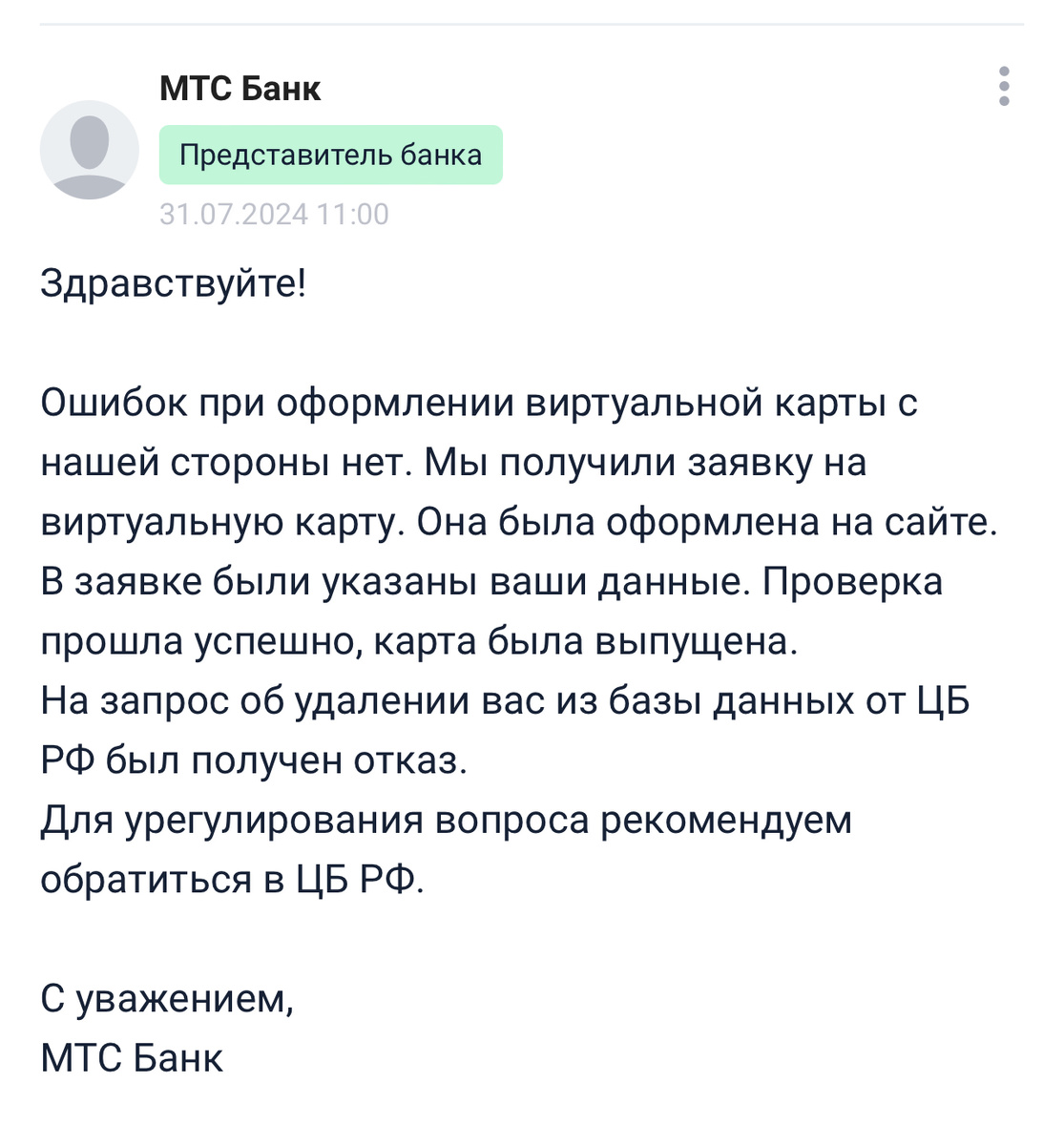 Я написала очередное обращение в МТС банк с требованием написать мотивирование обращение в Банк России об исключении меня из базы (только таким путем это возможно, т к мои данные попали в базу из за жалобы МТС банка).