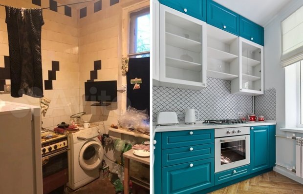 Бюджет: 2 млн рублей До переделки это была «убитая» грязная квартира с грудой хлама и мусора. Выцветшие мрачные обои, разваливавшиеся окна, сколотая плитка — жилье давно требовало капитального ремонта и обновления. Квартира оформлена в светлых тонах, чтобы впустить побольше света и визуально расширить небольшое пространство. Гарнитур в синем цвете выпо