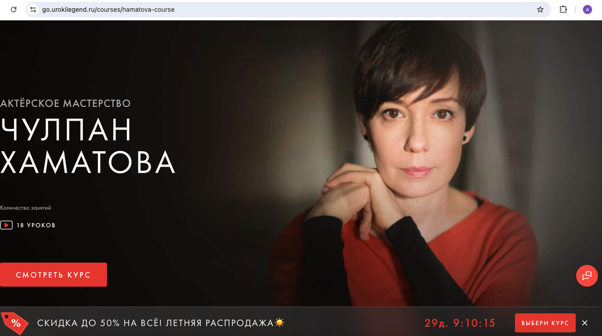 Он-лайн курс сбежавшей из "агрессивной" России в "мирную" Латвию Чулпан Хаматовой до сих пор можно купить на просторах российского Интернета. Кстати, недорого. Всего 4500 за три месяца обучения или 7990 за год. За эти деньги Чулпан Наилевна обещает обучить всех желающих азам театрального актерства и баз киноработы. А также научить "как актеру всегда оставаться в обойме" и "получать максимум предложений от режиссеров". Кстати, на обучающей платформе Чулпан значится Заслуженной и Народной артисткой РФ , ну теми титулами, от которых новоявленная гражданка Латвии презрительно отказалась на своей новой Родине. На обучающей платформе называющая россиян "грубыми и невоспитанными, в отличие от европейцев" Чулпан Хаматова не одинока. Помимо Чулпан Наилевны уроки актерского мастерства тут продает, также сбежавший в "свободную" Европу Максим Суханов. Кстати, партнер Чулпан по европейскому шедевру также русофоб Дмитрия Крымова и недовольный Россией Константин Райкин, записывающий ролики в под