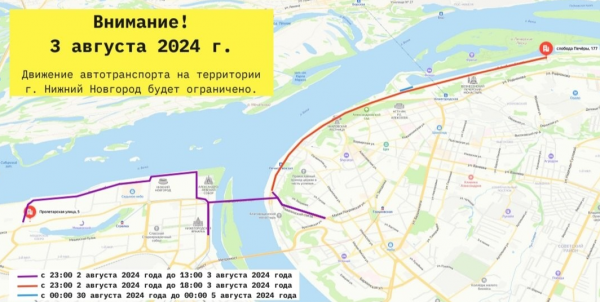 С 23:00 2 августа до 13:00 3 августа нельзя будет проехать по Похвалинскому съезду, Благовещенской площади, Канавинскому мосту, а также частично по Нижневолжской набережной, Черниговской, Советской, Самаркандской, Пролетарской и Совнаркомовской улицам, Стрелке и Волжской набережной.