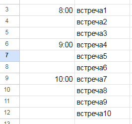 Это классический вопрос, который я видел бесчисленное количество раз. Например, рассмотрим следующий набор данных о времени встреч: В каждой пустой строке должно быть заполнено время, чтобы соответствовать непустой строке выше. Например, строки 4 и 5 — это 8:15 утра. С помощью новых функций LAMBDA эту задачу можно решить с помощью одной формулы: =SCAN(A3; A3:A12; LAMBDA(t; v; ЕСЛИ( ЕПУСТО(v); t; v ))) Функция SCAN сканирует диапазон данных и применяет внутреннюю формулу к каждому элементу в диапазоне. В этом случае мы предоставляем диапазон A3:A12. Таким образом, функция SCAN берет каждое значение в этом диапазоне, одно за другим, и применяет к нему внутреннюю функцию. Внутренняя функция проверяет, является ли значение в диапазоне пустой строкой или нет. Если в строке уже есть данные, то никаких дополнительных действий не требуется. То есть, если строка содержит 8:15 утра, то новый диапазон будет содержать 8:15 утра. Но если строка пустая, то выходной сигнал устанавливается равным зна