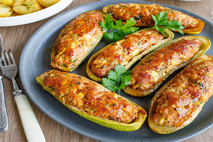 Фаршированные кабачки с соусом терияки, отлично сочетаются со свежими овощами и белым вином. Это блюдо не только порадует ваших гостей своим вкусом, но и станет настоящим украшением стола благодаря своему яркому и аппетитному виду. Ингредиенты: * 3 кабачка среднего размера * 500 г фарша * 3 зубчика чеснока * 50 - 60 мл соуса терияки * Черный молотый перец (можно острый перец добавить, кто любит поострее), соль по вкусу * Зелень 20 г * Сначала промойте кабачки, обрежьте "попку" и разрежьте их вдоль на две равные части * С помощью чайной ложки удалите середину, оставив толстые стенки * Посолите их изнутри и оставьте на 15 минут, чтобы кабачки отдали лишнюю влагу * Половину мякоти мелко рубим. * Соединяем фарш, мелко нарубленный чеснок, острый перец и зеленый лук, вливаем терияки и добавляем мякоть кабачков * Солим по вкусу (при этом помните, что в терияки уже есть соль) * Лишнюю влагу убираем при помощи салфетки (можно слегка придавить при вытирании) * Смажьте соусом терияки при помощи