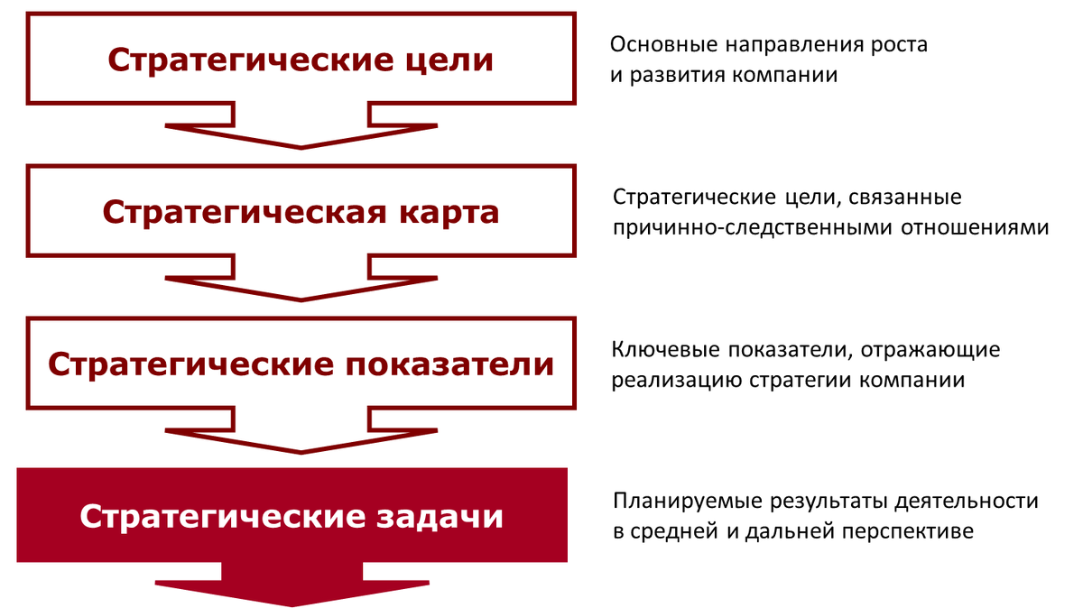 Понятно, что не всякая задача является стратегической. Для этого должны использоваться именно стратегические показатели, отражающие процесс реализации стратегии компании.
