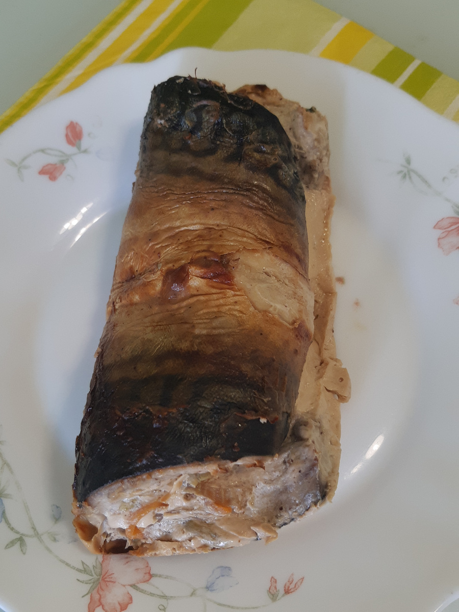 Состав: Приготовление: Скумбрию брала тушку замороженную. Размораживаем, моем. Отрезаем голову плавники и хвост. Делаем надрез по спинке, вынимаем внутренности (салфеткой) и достаём хребет и кости. Вот такое филе на шкурке получилось. Смешиваем горчицу, сметану, соевый соус и мускатный орех. Полученным соусом, кисточкой, смазываем филе с обоих сторон. Оставляем минут на 30. Овощей берём не много, чтобы хватило сделать три рулетика. Моркови и кабачок трём соломкой (на тёрке для корейской моркови) или режем. Лук режем полукольцами. Разогретую сковороду смазываем маслом и обжариваем лук до золотистого цвета. Затем добавляем морковь и кабачок. Слегка обжариваем минуты 3. Солим и перчим по вкусу. Делим на три части (по количеству рыбы) На рыбу выкладываем овощи и заворачиваем рулетом (от хвоста, к широкой части). Выкладываем на кусок пергамента и заворачиваем как конфету. Выкладываем «конфеты» в форму для запекания. Ставим в разогретую до 200 градусов духовку на 30-40 минут. Готово.