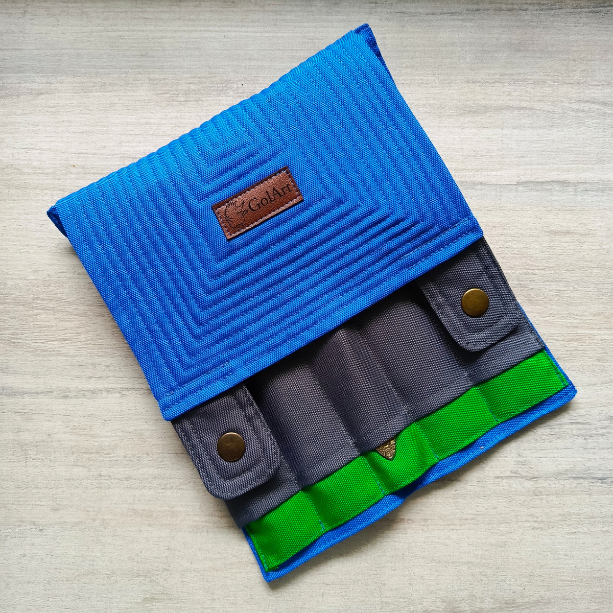Не живётся мне спокойно 😂 Собирала вещи в отпуск и когда дошла до посуды (мы с палатками ездим, поэтому у нас и котелок, и тарелки, и кружки, и ложки - всё с собой) упёрлась в эти самые ложки. Обычно мы их складывали на дно котелка и они там благополучно позвякивали всю дорогу ))) А тут я решила, что нужно придумать какой-нибудь чехол для них. В итоге села шить, придумывая проект на ходу. В итоге получилась вот такая штука: Которая легко легла на дно котелка (он у нас большой). Чехол, кстати, не мягкий - он хорошо держит форму. Получилось 5 отсеков под большие и маленькие ложки + вилки. Шила так: нашла обрезки Оксфорда 600. Из них получилось выкроить вот такие детали. Начала с крышки. Синюю деталь (ту, что поменьше) сложила пополам по длинной стороне и проложила строчку как показано на фото. Высекла уколки, вывернула и хорошенько расправила все швы. Внутрь получившейся детали вставила вот такую штуку. Это тонкая вспененная плёнка, которой обычно упаковывают технику. У меня лежал мален