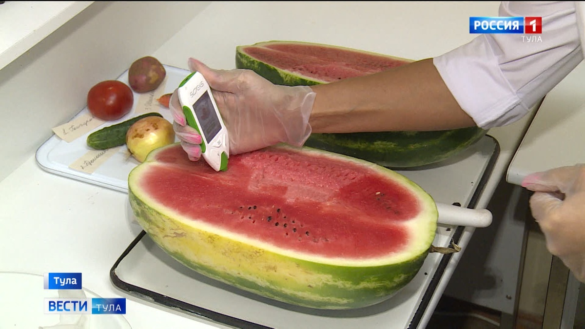 Классические красные и жёлтые для тех, кто страдает от аллергии. Любимые “полосатые” во всём своём многообразии продолжают активно заполнять прилавки. Но перед этим обязательно проходят проверку на безопасность. Надежда Корнева, заведующий лабораторией: – Основные показатели и исследования это органолептические показатели и основной метод – это содержание нитратов. По органолептике мы обращаем внимание на внешний вид, вкус, запах и цвет продукции, если обратим внимание на данный арбуз, то видно на срезе его искрятся кристаллики, которые говорят о зрелости продукта. Мы провели исследования на нитраты – они отсутствуют. Исследование в тульской лаборатории проводят с помощью специального прибора. Он и показывает, не превышает ли количество нитратов норму, если арбуз безвреден, то партия спокойно отправляется на прилавок. И тут уже выбор за покупателем. – Ну как бы мальчик, девочка, да. Вот там точечка поменьше – мальчик, точечка побольше – девочка. Вот берём всегда девочек и стучим, чтобы