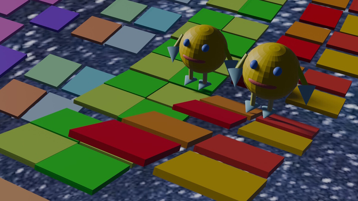Трехмерная сцена на сегодня. Вот космические цыплята идут в гости к кролику на чай. До кролика надо еще дойти. Какую дорожку выберешь ты? Осеннюю? Она оранжевая. Или летнюю? Она зеленая. А еще есть фиолетовая. Вот космические цыплята уже прыгают по этим дорожкам. Идут неспеша. Или бегут быстро быстро. Все по-разному туда идут. Давай поиграем в игру! Выбирай дорожку и пошли по ней. Надо пройти на другую сторону. Там кролик угостит тебя вкусным чаем. Если идти по оранжевой дорожке, то там будет маленькая дверка в осенний мир. В разный. Там может быть очень красиво. Много желтых и оранжевых листьев. А может попасться и дожди и много воды везде. И так бывает. А если идти по зеленой дорожке. То там будет маленькая дверка. И там будет целый мир с летом. Лето и поле. Подсолнухи растут. Хорошая погода. Бабочки летают. Или может быть пляж и море. С сними небом. Мимо таких дверок можно пройти. И тогда дойдя до конца дорожки – увидишь кролика. Он тебя угостит чаем. Дима Линк делает ретро видеоигр