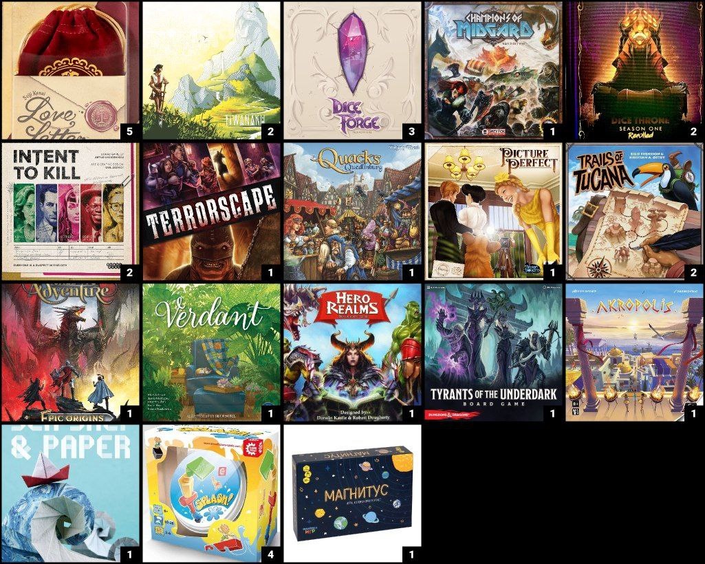 В этом месяце сыграл в 18 разных игр. Больше всего наиграли в Тайное послание, прям хорошо у нас пошла эта игра. Из новенького, добрался до дополнения к Dice forge и Тропы туканы, и сыграл в две новые для меня игры, о которых уже писал — это «Чемпионы Мидгарда» и «Идеальный кадр».