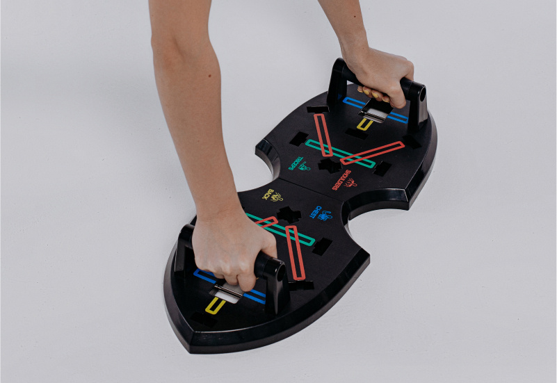 Платформы для рук — устройства, которые выводят эффективность от отжиманий на новый уровень. С помощью такого тренажера можно увеличить амплитуду движений и повысить нагрузку на мышцы. Также в платформе от UrbanFit есть упоры для отжиманий, которые вставляют под разным углом в пазы, окрашенные разным цветом — от этого зависит, какую часть тела вы прокачаете во время тренировки: красные — грудь, синие — плечи, зеленые — спина, желтые — трицепсы.