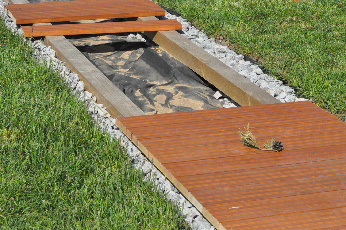 После укладки дорожки убедитесь, что все доски надежно закреплены. Можно заполнить зазоры между ними щебнем.