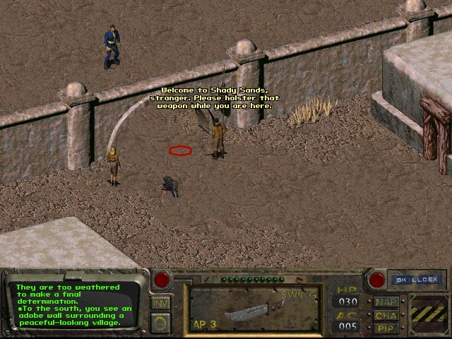 В игре же ностальгично добежал до деревушки Шейди Сэндс. Там, в ходе диалога со стражником, выбрал какой-то не тот вариант ответа (обленился переводить), после чего началась череда пугающих событий... ...ВНЕЗАПНО начался бой и незадачливого выходца из убежища № 13 быстро завалили 😅