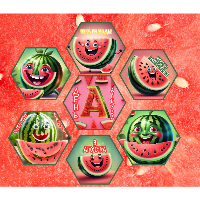 Украшение: украсьте комнату воздушными шарами, гирляндами и ярко-зелеными и красными арбузными плакатами. Для оформления можно использовать гексы. Ссылка для скачивания: https://infourok.ru/magazin-materialov/geksa-den-arbuza-3-avgusta-331753 Костюмы: дети могут носить одежду с рисунком арбуза или зелено-красных цветов.: