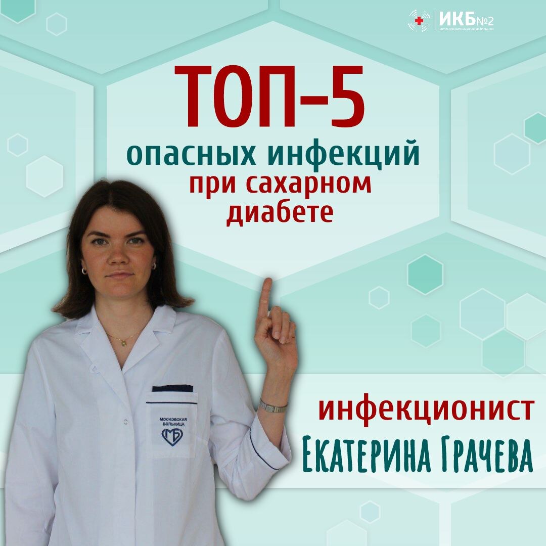 Имея в анамнезе сахарный диабет, важно быть особенно осторожным – следить за состоянием уровня сахара в крови и не забывать о профилактике. В противном случае можно стать мишенью для ряда инфекций, которые, учитывая этот диагноз, считаются опасными! Что это за заболевания, рассказала врач-инфекционист Екатерина Грачева: Кишечные инфекции часто сопровождаются рвотой и диареей, что может привести к обезвоживанию и стать причиной декомпенсации диабета. Такие скачки уровня глюкозы в крови могут быть очень опасными, вплоть до летального исхода. Кроме того, изменение уровня сахара в крови также негативно влияет на иммунитет и усугубляет течение инфекции. Пациенты, страдающие сахарным диабетом, по сравнению со здоровыми людьми, подвергаются повышенному риску инфекций дыхательных путей, таких как внебольничная пневмония. Сахарный диабет способствует развитию поражения мелких сосудов легких, изменяя их функциональное состояние. У таких пациентов сахарный диабет вызывает стертую клиническую сим