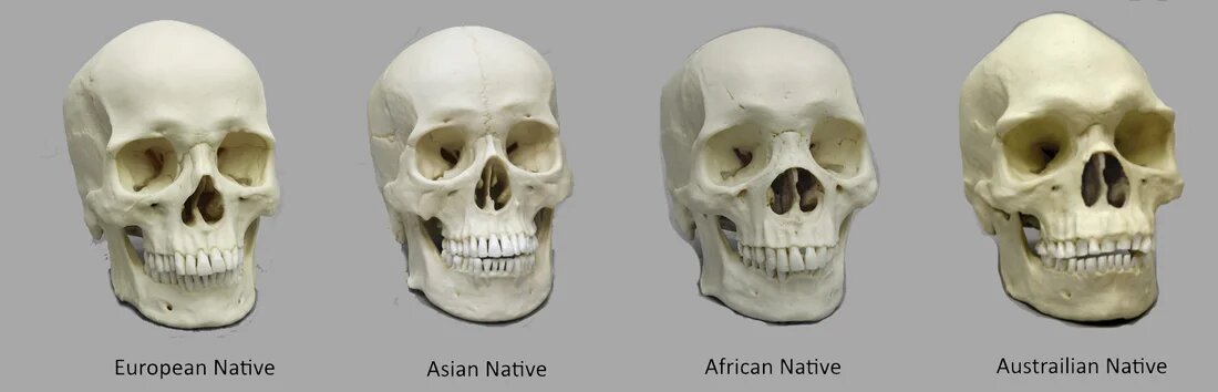 Человеческий череп различается у представителей разных этнических групп или рас в основном из-за генетических особенностей и адаптаций к различным условиям окружающей среды, включая климат, диету, и культурные практики. 1. Климатические адаптации: Для приспособления к разным климатическим условиям череп человека может изменяться. Например, черепа людей, проживающих в холодных климатах, могут иметь более круглую форму и более крупный размер, что помогает сохранять тепло. В то время как у людей, проживающих в тёплых климатах, череп может иметь более удлинённую форму для эффективного отвода тепла. 2. Эволюционные адаптации: В ходе эволюции человеческий череп также претерпевал изменения под воздействием различных факторов. Некоторые черты могли развиваться в ответ на изменения в образе жизни, питании, обитании и других факторах. 3. Генетическое разнообразие: Различия в черепах между расами также могут быть следствием генетического разнообразия. Разные группы имеют свои уникальные