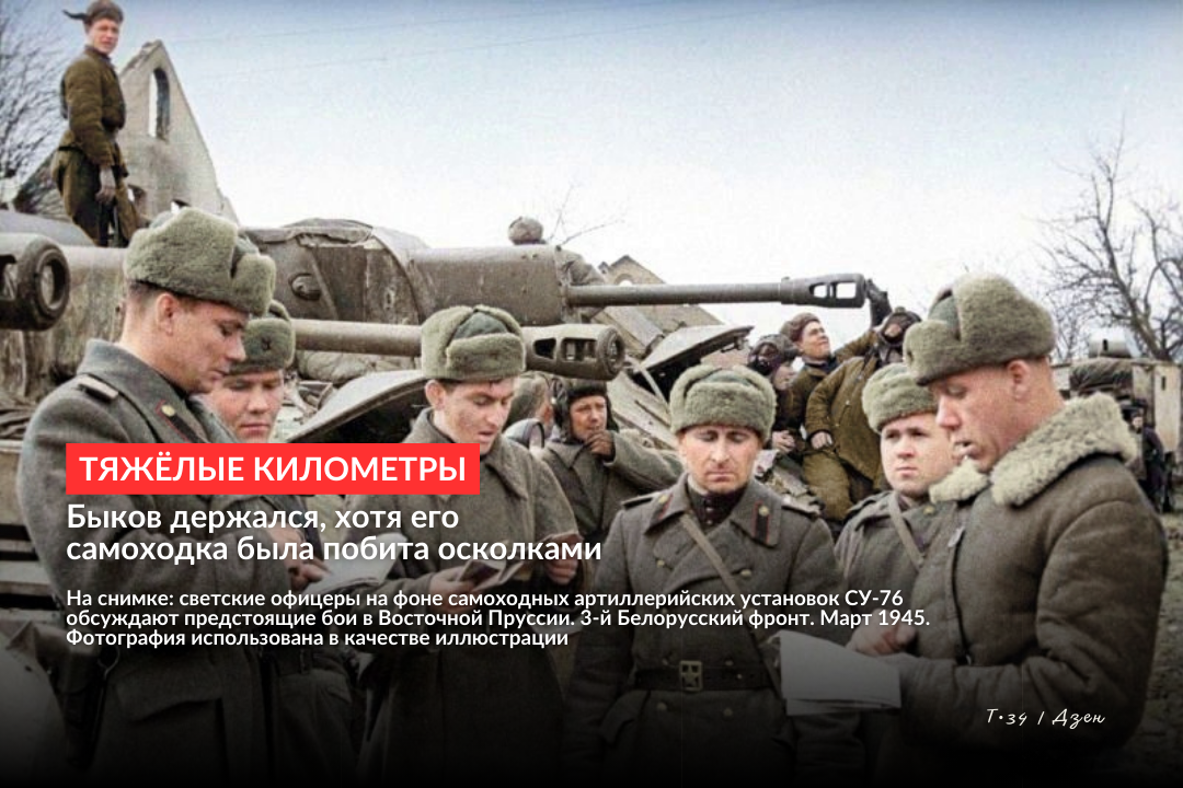 До Берлина — всего шестьдесят километров. Но они будут длинными, тяжёлыми. Это знает каждый офицер и солдат нашего 444-го отдельного самоходного артиллерийского дивизиона. В этом твёрдо уверен и мой товарищ по оружию командир самоходной установки младший лейтенант Павел Быков, уроженец Ярославской области. Вечером 21 марта получен боевой приказ: расширить плацдарм за Одером. Долго не ложился спать Павел Быков. Он проверил готовность экипажа, потом уселся за письмо домой. А утром первым вывел машину на исходные позиции, к дамбе. Она была у противника как на ладони. Стоило первой машине подняться на гребень дамбы, и сразу же заговорили пушки. Одну самоходку гитлеровцы подбили. Остальные семь перевалили опасный рубеж. Но за ним простиралось широкое поле. За полем — деревня Ной-Блейон, где засели гитлеровцы.