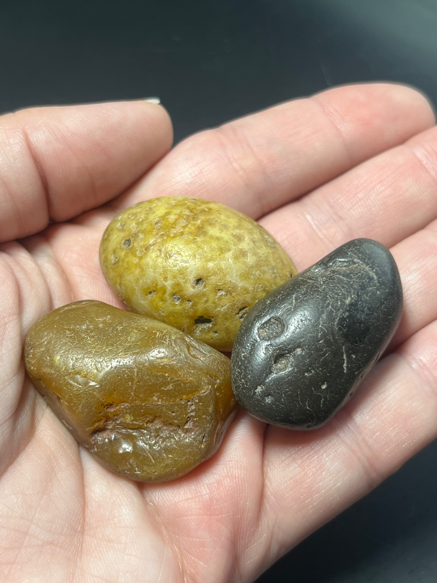 Всем привет! Наконец-то появилось немного свободного времени. А это значит, девятой серии распила камней быть! Все камни собраны мной на реке Кача в Красноярском крае. Наша река богата на агаты, сердолики, яшмы, халцедоны и многое другое. Дома все камни я сортирую и раскладываю по контейнерам. Эти три камня из разных контейнеров. Постаралась подобрать разных цветов. Теперь давайте посмотрим поближе, чем они примечательны. И так, первый камень однозначно должен быть ониксовым агатом. Проще говоря, полосатик. В своих видео я уже показывала вам такой же низ камня. И это явный признак наличия слоев. И я не ошиблась! Смотрите сами. Вот они, полосочки. Правда, в этот раз какие-то не четкие. Как помехи в телевизоре. Теперь давайте посмотрим на второй камень. На поверхности камня виден легкий рисунок. Но бывает и так, что это всего лишь рисунок на корочке камня. Но что-то мне подсказывает, что и внутри камня нас ждет нечто рисунчатое. Давайте посмотрим. Вы только посмотрите на это! У