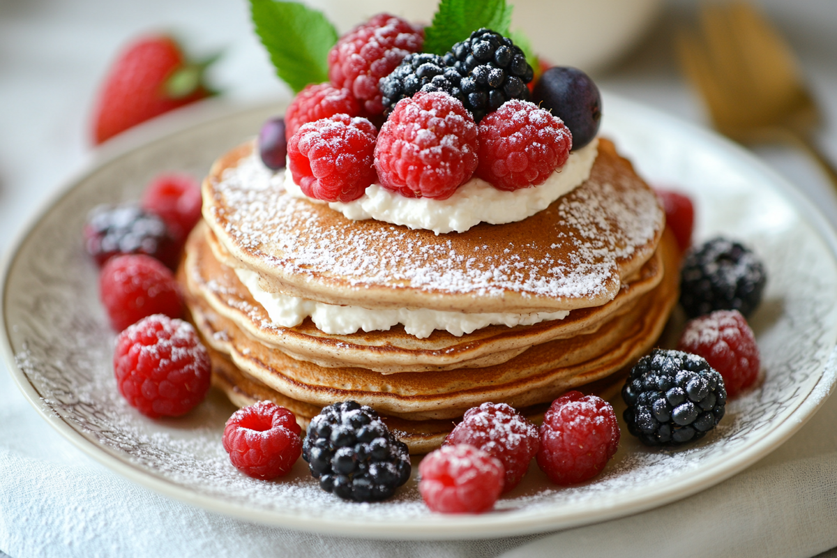Подавайте гречневые блины с творогом и ягодами, полив сверху медом или кленовым сиропом. Можно украсить дополнительными ягодами и веточкой мяты.