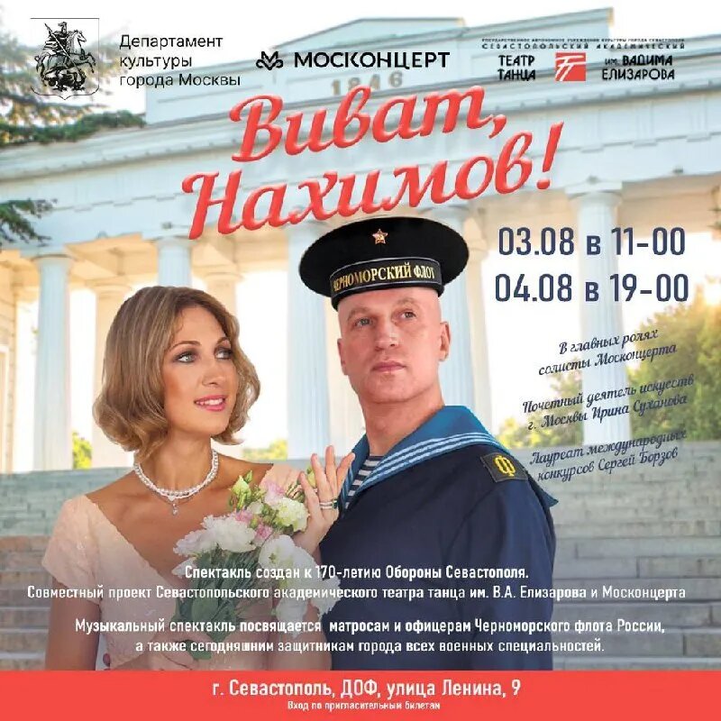 3 и 4 августа на сцене Дома Офицеров Черноморского Флота Российской Федерации состоится премьера музыкального спектакля «Виват, Нахимов!». Москонцерт совместно с Севастопольским академическим театром танца им. Вадима Елизарова и оркестром УМВД г. Севастополя представит спектакль к 170-летию Обороны Севастополя, посвящённый матросам и офицерам Черноморского флота России, а также сегодняшним защитникам города всех военных специальностей. Совместный проект с Севастопольским академическим театром танца — новый формат в деятельности Культбригады Москонцерта. Символично, что в главных партиях выступят участники Культбригады, которые регулярно работают для военнослужащих на передовой — Сергей Борзов и Ирина Суханова. Гордимся тем, что наша идея и сценарий, основанный на исторических событиях, нашли отклик у одного из лучших танцевальных коллективов Крыма — академического театра танца имени Елизарова, а премьера состоится в те дни, когда Севастополь переживает новую оборону. Надеемся, что доку