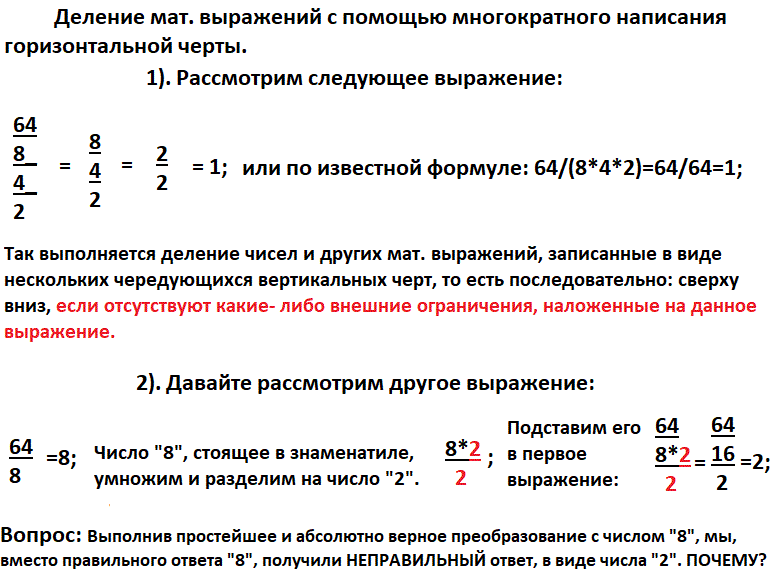 ( ОБРАЩАЮ ВНИМАНИЕ моего читателя на тот факт, что здесь правило - НЕ ЯВЛЯЕТСЯ КАКИМ-ТО СПЕЦИФИЧЕСКИМ "МАТЕМАТИЧЕСКИМ ЗАКОНОМ". Оно является лишь ОДНИМ ИЗ ВОЗМОЖНЫХ СПОСОБОВ ПОДСЧЕТА ВЫРАЖЕНИЙ. Скажем немного иначе: любая линейная последовательность, состоящая из числовых, буквенных или смешанных выражений и где присутствует несколько знаков деления "двоеточие" и знаков умножить, - всегда имеют множество возможных решений. Поэтому и придумываются, и принимаются в практику решения подобных примеров некие условные правила лишь только для того, чтобы "отсечь" это множество решений и оставить ОДНО- ЕДИНСТВЕННОЕ, из всех возможных!
