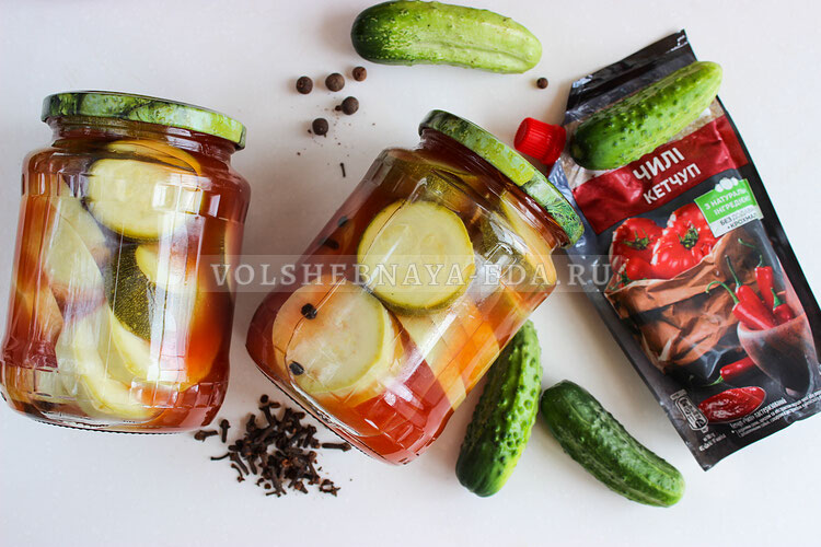 Для консервирования годятся только молодые кабачки или цукини. Если овощи старые, лучше пустите их на икру. В маринованном виде они, к сожалению, будут невкусными, слишком водянистыми и жесткими. Совет! По этому рецепту можно консервировать огурцы в кетчупе чили. Маринад и процесс приготовления будут точно такими же, а результат вас приятно порадует зимой, когда вы откроете очередную баночку. В каждую банку объемом 1 литр: Для маринада (хватит на 5 банок): Заранее подготовить тару: банки объемом 1 литр вымыть, простерелизовать (можно сделать это в микроволновке, влив в банки немного воды). На дно каждой баночки бросить по 1 горошине душистого перца, по 3 горошины черного перца и по 1 гвоздике. Кабачки (и/или цукини) помыть, нарезать колечками толщиной примерно 1 см. Наполнить банки доверху — в одну помещается примерно 1,5 кабачка, но все зависит от размеров и плотности укладки. Если будете консервировать таким образом не кабачки, а огурцы, то не забудьте предварительно их вымочить в во