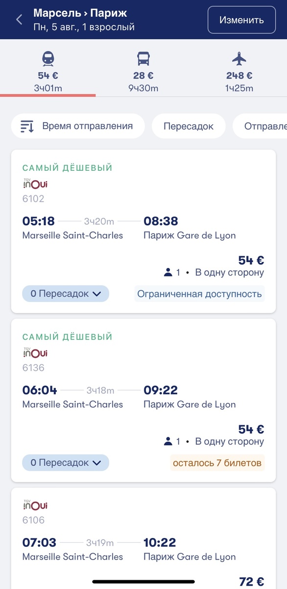 Во Франции существует пять основных типов поездов SNCF: поезда TGV, Ouigo, Intercités, TER и RER. Знаменитые французские высокоскоростные поезда по Франции с 1981 года. По специальным трассами TGV поезда могут разгоняться до 320 км/ч. Сеть постоянно расширяется, маршруты TGV поездов ведут к: TGV также курсируют по обычным путям с обычной скоростью, например, высокоскоростной поезд из Парижа в Марсель. Стоимость билетов варьируется больше в зависимости от времени, дня отправления и покупки заранее. Цены могут отличаться очень сильно (пример приведу ниже). Если хочется сэкономить: нужно старательно выбирать время поездки и покупать заранее. С дешевыми билетами выезд, как правило, будет часов так в 6 утра, или приезд за полночь. Билеты можно купить на omio.ru (omio.ru/trains/france) Компания существует с 2013 года, до начала 2019 была известна как GoEuro. Omio позволяет сравнить стоимость и продолжительность поездки различными видами транспорта, чтобы выбрать самый быстрый и выгодны
