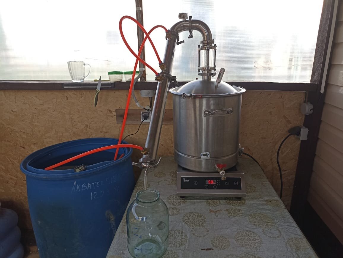 Здравствуйте, друзья! Была у меня на канале статья такая "Охлаждение самогонного аппарата с помощью аквариумной помпы". Способ очень хорош, но есть небольшой минус - не хватает на долгий перегон. Вода в бочке нагревалась и либо надо было менять воду, либо класть в неё замороженные с водой пластиковые бутылки. Хотя на 30 литров браги хватало и так. В общем гнал именно с помощью аквариумного насоса, так как насос из колодца типа "Ручеёк" для этих дел не подходил. Выглядело это вот так: И вот я решил приобрести себе насос с гидроаккумулятором на 20 литров и с реле давления. Цена насоса+ к нему покупал обратный клапан вышло около 7000 руб. Кран запорный с вентилем, ПНД трубка и соединения уже были, остатки от монтажа водопровода. Пока поставил в сарай, временно, так как сарай идёт под снос, буду делать новое более вместительное помещение для нужд самогонных. Пробно запустил систему и всё прекрасно заработало, выход воды, тоже временно сделал обратно в колодец. Решение очень хорошее, на