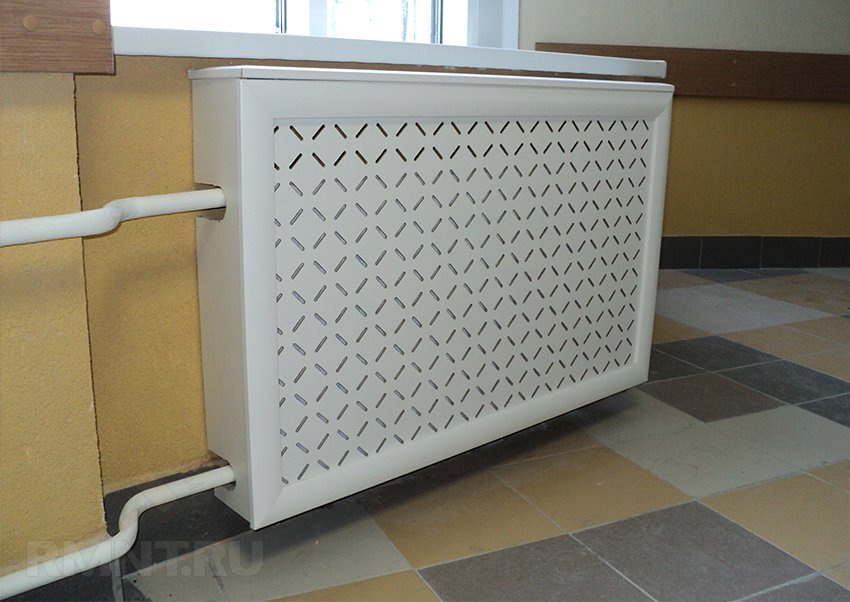 Основной элемент экрана — это фасад в виде плоской декоративной панели с отверстиями, обеспечивающими естественную конвекцию воздуха. Верхнюю и боковые панели используют не всегда — зависит от места, где установлена батарея. Например, наличие широкого подоконника и ниши делают их необязательными.