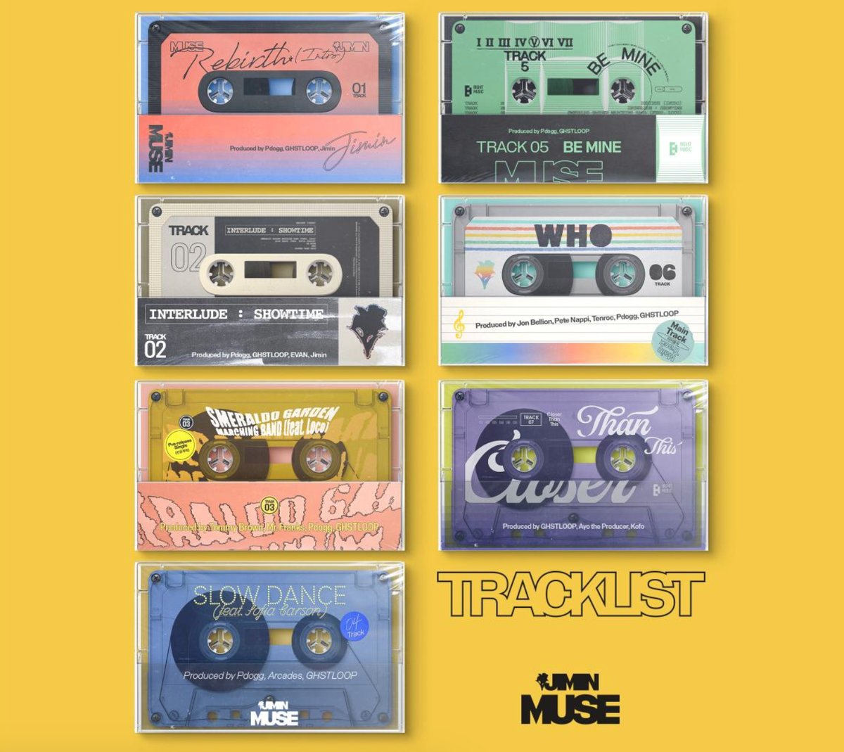Альбом MUSE, выпущенный 19 июля 2024 года, включает семь треков. Среди них — цифровой сингл Closer Than This, который был представлен 22 декабря 2023 года в качестве фанатской песни для Арми. Предрелизный сингл Smeraldo Garden Marching Band (feat. Loco), вышедший 28 июня, является третьим треком в альбоме. Остальные пять треков идут в следующем порядке: Rebirth: Intro, Interlude: Showtime, Slow Dance, Be Mine и Who, главный сингл альбома. В плане музыки альбом охватывает множество жанров, сочетая олдскульный хип-хоп с латинскими битами и джазовым звучанием эпохи биг-бэндов. С точки зрения музыкальности, MUSE демонстрирует иную версию Чимина, отличающуюся от FACE, хотя его фирменный вокал остается на месте.