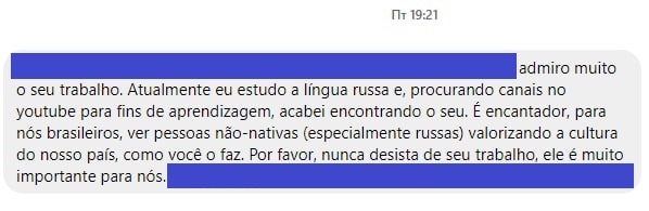 Недавно получила отзыв — публикую с разрешения подписчика. Он изучает русский язык и восхищается моим YouTube-каналом. Просит не бросать начатое дело: оно очень важно. Пишет, что бразильцам нравится видеть, когда их культуру ценят, особенно если это делают русские. Спасибо большое! Muito obrigada!