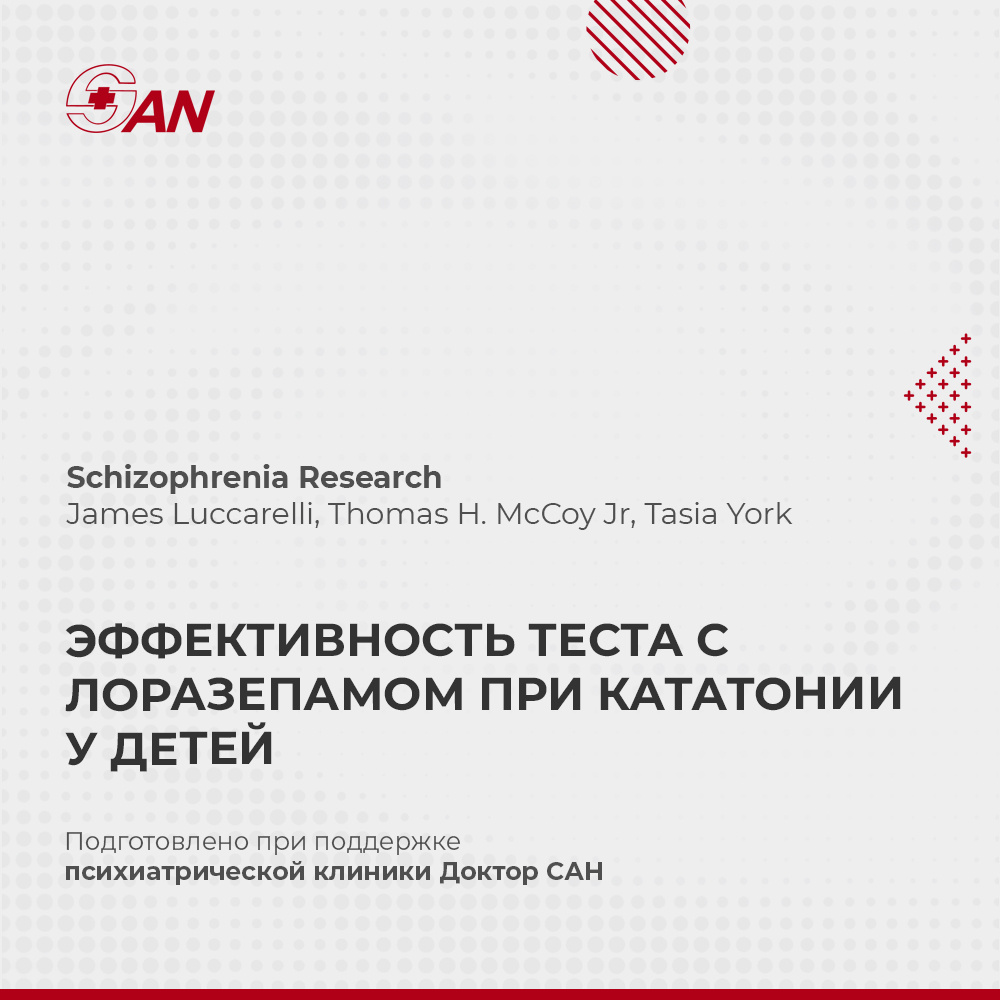 Кататония — это нейропсихиатрическое расстройство, связанное с изменениями поведения и эмоций. У взрослых кататония может быстро поддаваться лечению бензодиазепинами в рамках «теста с лоразепамом». В многоцентровом ретроспективном когортном исследовании оценивалась эффективность лечения бензодиазепинами при кататонии у детей. Среди 54 пациентов медианный возраст составил 16 лет. Нарушения нейроонтогенетического развития присутствовали у 24 (44,4 %) пациентов. До лечения средний балл по Шкале выявления кататонии Буша-Френсиса у пациентов составлял 16,6 ± 6,1, который значимо снизился до 9,5 ± 5,3 после лечения лоразепамом, что представляет собой большой размер эффекта. Не было обнаружено значимой связи между дозой лоразепама или путем введения и клиническим ответом, а также не было связи возраста, пола, места исследования, наличия расстройства нейроонтогенетического развития, наличия гиперактивных кататонических черт или времени между лечением и повторной оценкой по Шкале выявления ката