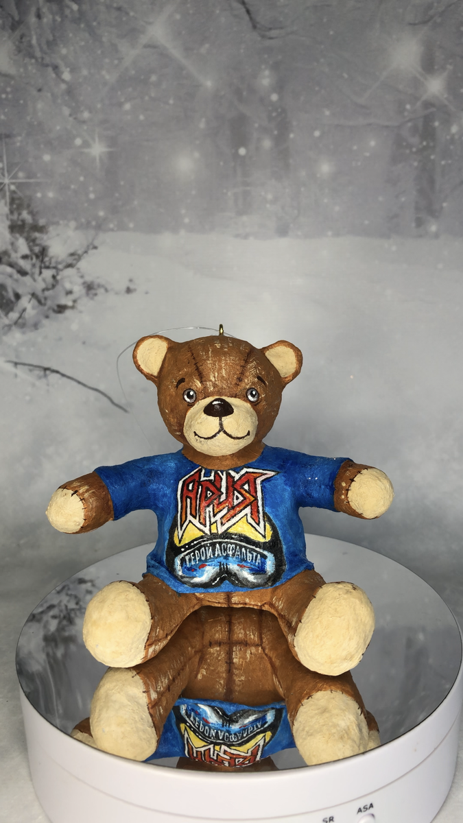 Это не мягкая игрушка, хотя сделана полностью из льняной ваты и клейстера. Технология изготовления - ватное папье-маше. Это полностью ручная работа. Игрушка расписана акриловыми красками и сбрызнута лаком. Высота 10 см, имеет подвес. Может служить интерьерной игрушкой, а может висеть на новогодней елке, потому что изначально такая техника использовалась для изготовления елочных игрушек. Почему именно медведь? Мягкие игрушки (небольшие мишки в футболках с тематическим изображением) продаются в официальном интернет-магазине группы "Ария". Но там только на груди принт, на спине-нет. А такой игрушки, еще и с портретом любимого музыканта, больше нет ни у кого. Это делается в единственном экземпляре по индивидуальному заказу. Ватные игрушки я делаю давно, можно полюбоваться ими и сделать заказ в моей группе Вконтакте Видео здесь или в блоге на ДЗЕНЕ или здесь, в комментариях и личных сообщениях.