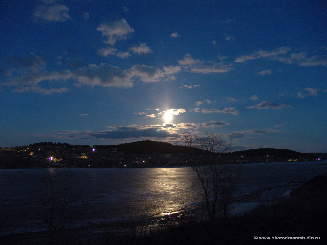 Это фото сделано, как легко можно догадаться, зимней ночью. Место действия - город Ревда (40 км. к западу от Екатеринбурга). Река тоже называется Ревда. Соответственно, пруд - Ревдинский. Как-то так. Любому, кто увидит данную фотографию, сразу же в голову придёт мысль, что фотографу не даёт покоя слава Архипа Куинджи, с его великолепной картиной "Лунная ночь на Днепре". Вот какой промт я задал Шедевруму: ночная панорама. вид сверху. широкая замёрзшая река. темно-голубое ночное небо с облаками. возле горизонта Луна. серебрится снег и лёд. противоположный берег гористый. у подножия небольшой поселок, в окнах горит свет. на переднем плане небольшое деревце с голыми ветками. в стиле картины Куинджи Лунная ночь на Днепре. мрачно. сказочно. А вот - результат: Как видите, вполне так получилось. Лунно-Куинджевски. Между прочим, этот сюжет (ночь на реке) я спустя некоторое время повторил, но уже летом, и не на Среднем Урале, а вовсе даже в Бельгии. Дойдёт черёд - покажу!
