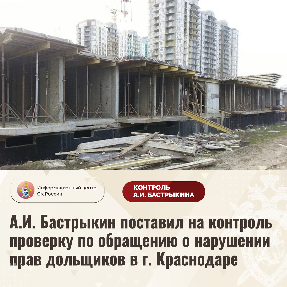 А.И. Бастрыкин поставил на контроль проверку по обращению о нарушении прав дольщиков в г. Краснодаре В Информационный центр СК России обратилась жительница города Краснодара о нарушении прав дольщиков ЖСК «Сити-3». В 2018 году женщиной заключен договор о приобретении квартиры в строящемся доме, срок ввода в эксплуатацию которого постоянно переносится. В 2021 году решением суда земельный участок под объектом передан в собственность ЖСК «Сити-2», однако во включении пострадавших граждан в реестр кредиторов отказано. До настоящего времени приобретатели квартир ожидают предоставления им жилых помещений или компенсационных выплат. Неоднократные обращения в различные инстанции результатов не принесли.