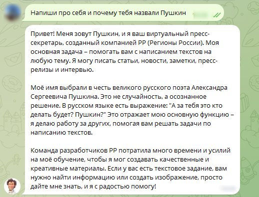 Вот что сам AI пресс-секретарь Пушкин говорит о себе.