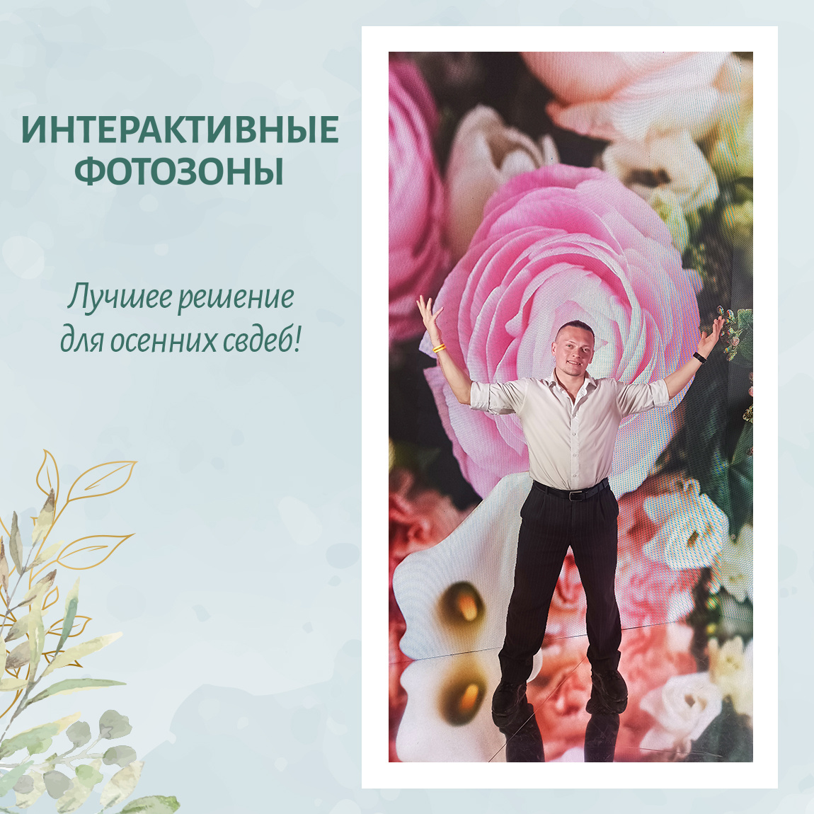 Лучшее современное решение для записи эффектных видеопоздравлений и фотосъёмки гостей — интерактивные фотозоны. Это и отличное развлечение, которое никого не оставит равнодушными. Только представьте: Вы только что фотографировались с родителями жениха на фоне пышных и красочных цветов, а спустя минуту с подругой позируете на фоне винных пробок! А потом записываете видеопоздравление на светящимся фоне, чувствуя себя участником шоу “Голос”. Это ярко, залипательно и очень эффектно! Фоны, как правило, подобраны так, чтобы было интересно и молодым ребятам, и консервативным людям, и детям. Наиболее активных пользователей сети такая фотозона заставит генерировать много контента с Вашей свадьбы. Так что, сторис, как минимум, с