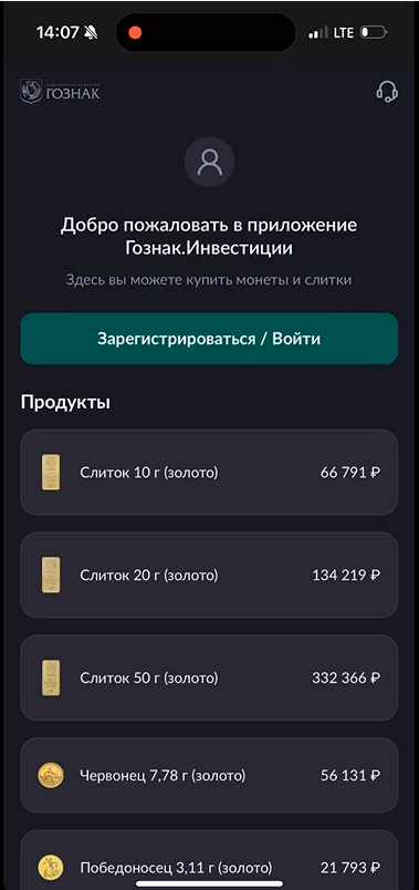Для начала, скачайте приложение: 👉 AppGallery 👉 RuStore 👉 NashStore 👉 Для пользователей телефонов Apple сервис доступен через веб-версию После этого, нужно нажать «Зарегистрироваться», либо «Войти», если у вас уже есть ранее зарегистрированный аккаунт. После того, как вы вошли, вам нужно пройти идентификацию. Для этого нажмите «Пройдите идентификацию» и далее «Онлайн-идентификация», либо «Tinkoff-ID»: Далее вы можете ознакомиться с Главным меню: Витриной: Котировками золота за определенный период: Статистикой: После чего, все, что вам остается – пополнить баланс, выбрать нужный слиток или монету и купить его. После приобретения монеты или слитка, вы можете оставить его в безопасном месте в хранилище Гознака (всего 50 рублей в год за одно изделие), либо забрать домой из Московского монетного двора. Для этого нужно нажать «Записаться на встречу» и выбрать «Забрать монету/слиток». Если вас интересуют любые другие вопросы по пользованию приложением или покупке золота, вы в любой момент