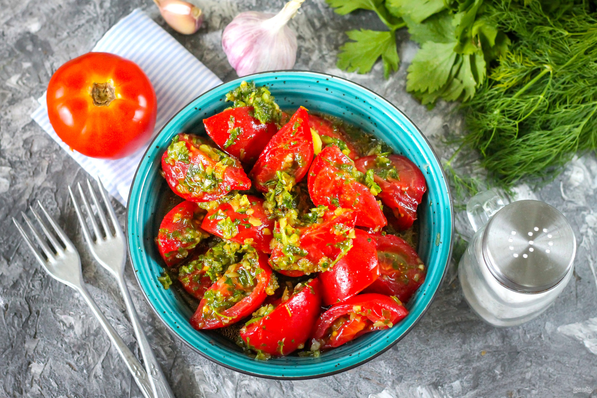- Плотно уложите помидоры в предварительно стерилизованные банки, перекладывая слоями с овощной заправкой, и залейте маринадом. Накройте банки крышками и оставьте мариноваться на 2–3 часа.