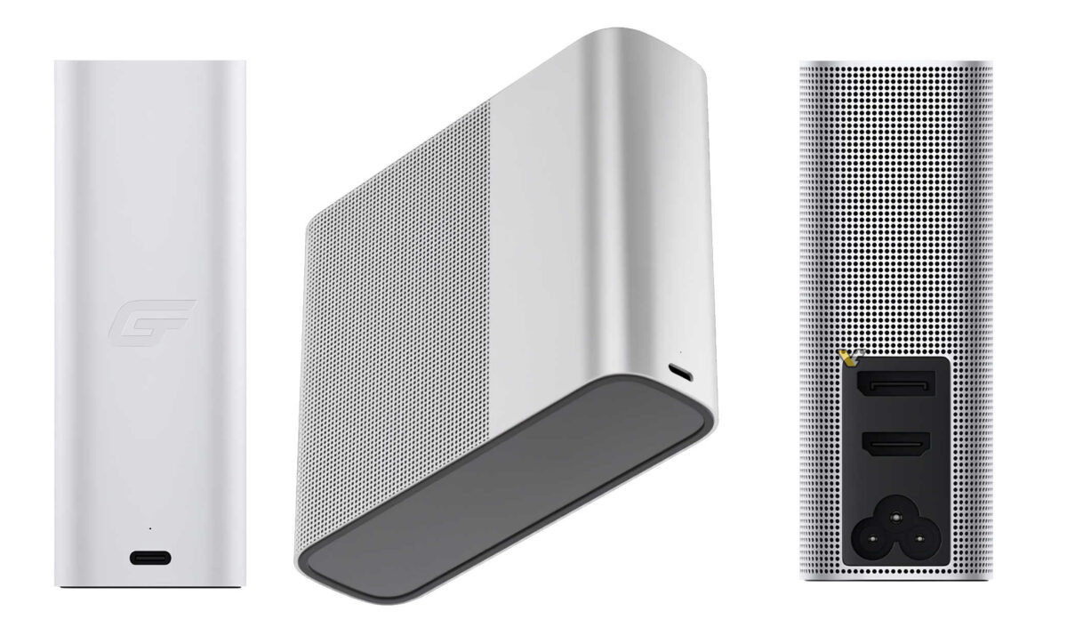 WIKA Hi GT Cube сама выглядит как мини-компьютер, но на деле содержит внутри видеокарту Radeon RX 7600 XT. Подключил к ноутбуку с мощным процессором и достаточным объёмом ОЗУ и получил игровое решение. Внутри у карты чип Navi 33 на 2058 потоков, 8 ГБ GDDR6 памяти и 128-битная шина. Из розетки видеокарта кушает 240 Вт при потреблении карты до 120 Вт. Около 100 Вт устройство отдаёт ноутбуку как зарядное устройство. Размерами Cube совсем не куб — 139 × 119 × 41 мм, грани скруглены, а доступ внутрь обеспечивает перфорация корпуса. Выглядит поприятнее других коллег по цеху: самое то в качестве стационарной зарядной станции в офисе, да и с собой в рюкзак можно спокойно закинуть. Только портов маловато: зарядка, USB-C с поддержкой Thunderbolt (которую точно не подтвердили) для подключения к компьютеру, DP и HDMI для подсоединения дополнительных мониторов. Подключить к дешёвому ультрабуку, наверное, такую карту можно, но не факт, что она будет работать. В первую очередь устройство позици