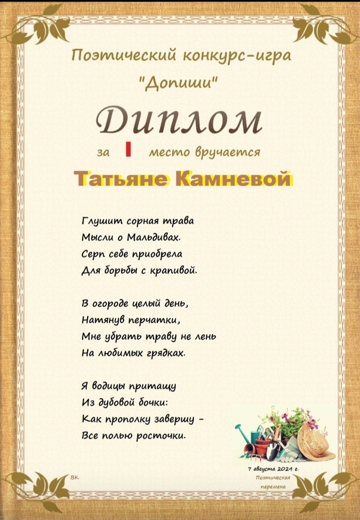 У меня радость которой я хочу поделиться с вами мои любимые читатели. Стихотворение моё заняло первое место. Сама не ожидала , что будет так. Глушит сорная трава Мысли о Мальдивах. Серп себе приобрела Для борьбы с крапивой. В огороде целый день Натянув перчатки, Мне убрать траву не лень На любимых грядках. Я водицы притащу Из дубовой бочки. Как прополку завершу Все полью росточки.