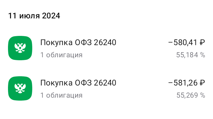11 июля пополнил счёт и приобрёл 2 ОФЗ 26240. Выбрал эту облигацию так как у нее была ближайшая дата выплаты купона.