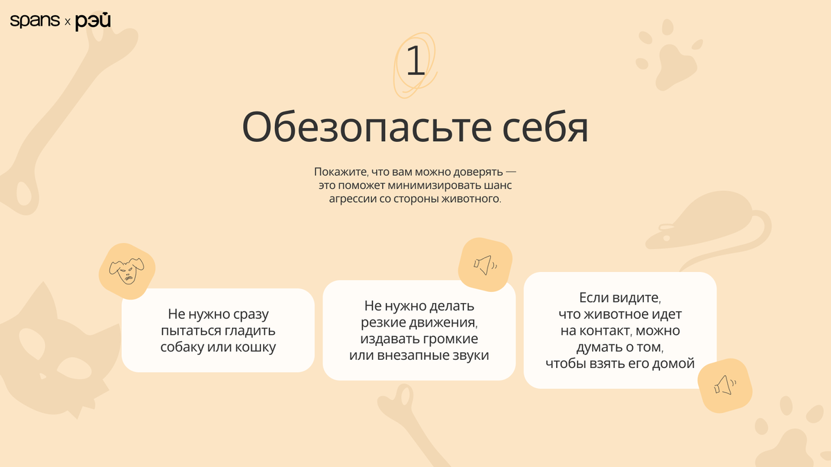 Ко Всемирному дню бездомных животных диджитал-агентство Spans (про нас — тут: https://spansagency.com/) и фонд РЭЙ сделали карточки про то, что делать, если взял животное с улицы. Спойлер: очень важно заранее подготовить себя и дом к появлению питомца, ведь на незнакомой территории его может ждать огромное количество опасностей, о которых мы и не подозреваем — например, комнатные растения или хозяйские шоколадки. Чек-лист от эксперта: первые правила знакомства с животным с улицы Вот главное, на что стоит обратить внимание — рассказывает эксперт фонда РЭЙ: Кстати, недавно фонд РЭЙ запустил специальный проект «9 историй» (https://9.rayfund.ru/) — он рассказывает о том, как животные из приютов и с улицы находят дом. Если вы переживаете, что жизнь с кошкой или собакой из приюта будет сложной, прочитайте эти истории — они точно покажут, что животные из приютов такие же любящие и нежные питомцы. А если вы думаете о том, чтобы завести себе домашнего любимца, то проект также будет полезен — н