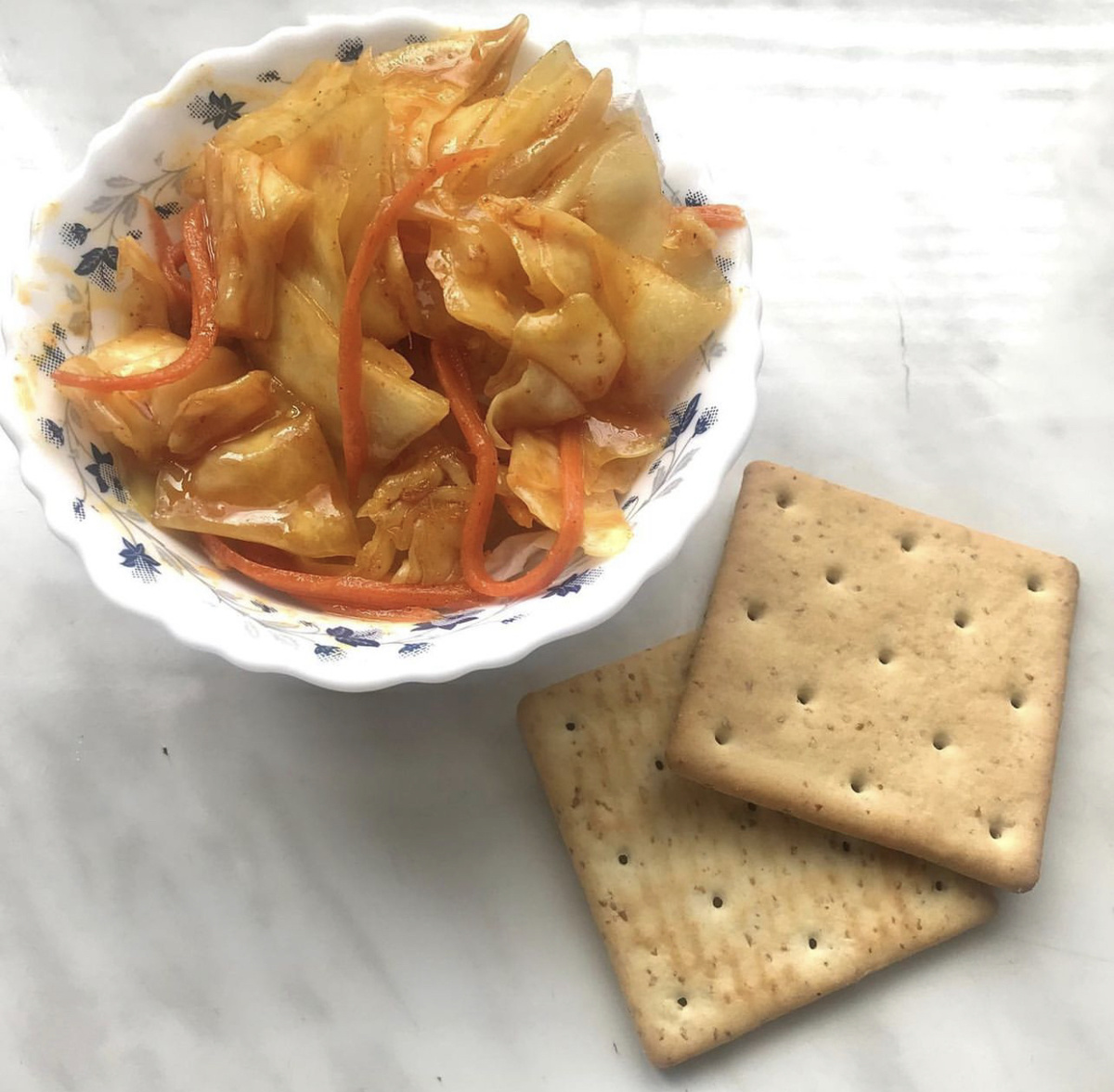 Капуста по-корейски 🥗 Обещала поделиться рецептиком, делюсь 😉 Сохраняйте в закладочки ❤️ Если капусты небольшое количество, то ориентируйтесь на указанные граммы и ложки указанных приправ. Потребуется капуста вилок,(с кочерыжкой) 2кг 650гр, морковь средняя 350гр, чеснок 5 больших зубчиков, масло растительное 75 мл, соль по вкусу, сахар 3 ст.л, жареный кориандр 3 ч.л, паприка 1 ст.ложка, острый красный перец по вкусу, куркума для цвета 2 ч.л, уксусная эссенция 70%1-1,5 ст.ложки. Приступаем к приготовлению. Разрезаем капусту на 4 части, отрезаем кочерыжку и потом каждую часть на квадратики, треугольники кому как удобно, раскрываем все это на листики, посолить (1 ст.ложку соли и хорошенько перемешать до образования "слезок" на капусте. Оставить на 30 минут, периодически перемешивая. А мы, тем временем, займемся морковкой. Натереть на терке для корейской моркови, можно на любой другой терке, лучше конечно, чтобы она была нарезана соломкой. Добавить к отстоявшейся капусте, снова перем