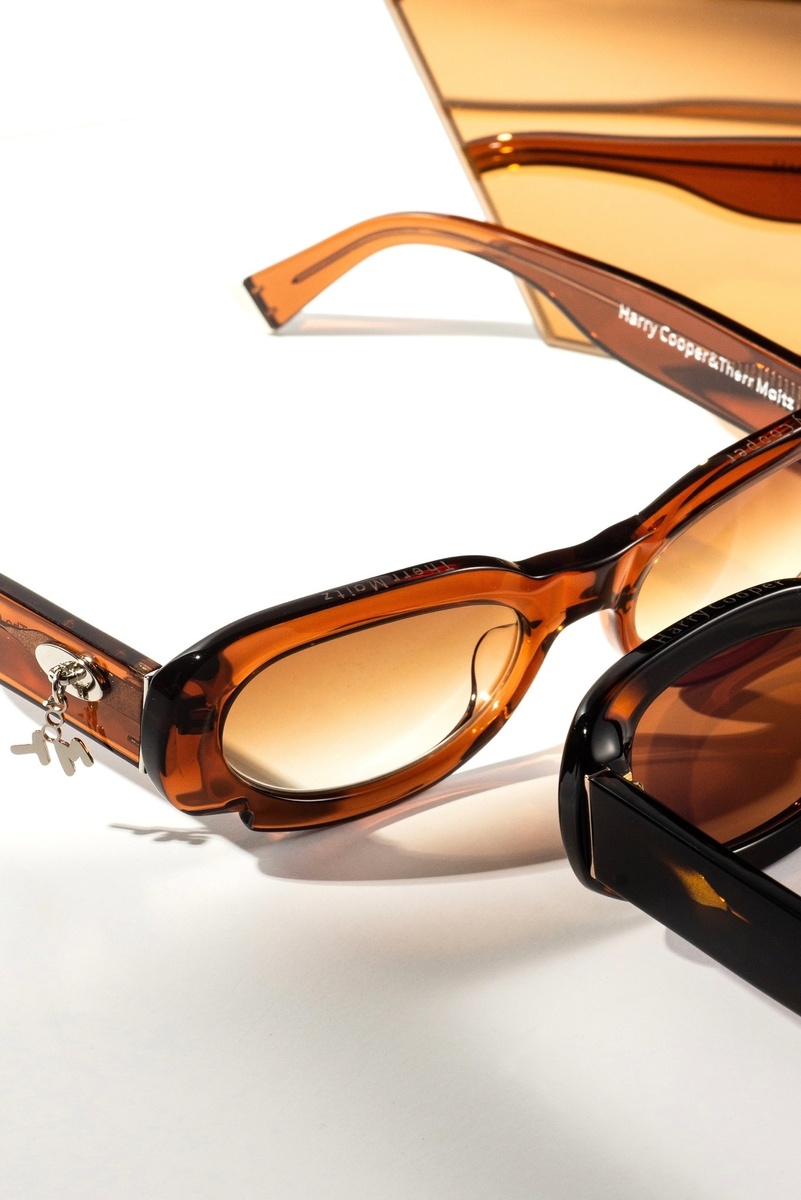 Рискнули и впервые за всю историю бренда спрятали на заушниках маленький брелок ТМ. Вариантов расцветки сделали четыре: черный, прозрачный, черепаховый и карамельный. Вторая оправа Night Bridge — оверсайз в мире очков. С широкой рамкой, одновременно круглая и геометричная, и неизменно со «сколом» — маленькой, но очень концептуальной деталью, отсылающей к логотипу Therr Maitz. У оправы три варианта исполнения: черный, прозрачный и черепаховый. Цена на каждую модель из коллаборации с Therr Maitz — 13 500, включая линзы по вашему рецепту и чехол.